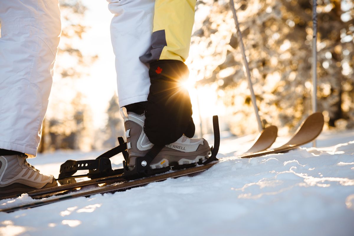 Suitable personal clothing for winter weather including warm boots, hat and gloves or mittens. For this activity, guests use their own winter boots. The ski bindings are designed to work with almost all types of regular winter footwear, so no special ski boots are needed. Please note that fashionable Moon Boots are not suitable for this activity, as they are usually too bulky to fit safely into the bindings and provide limited ankle support.