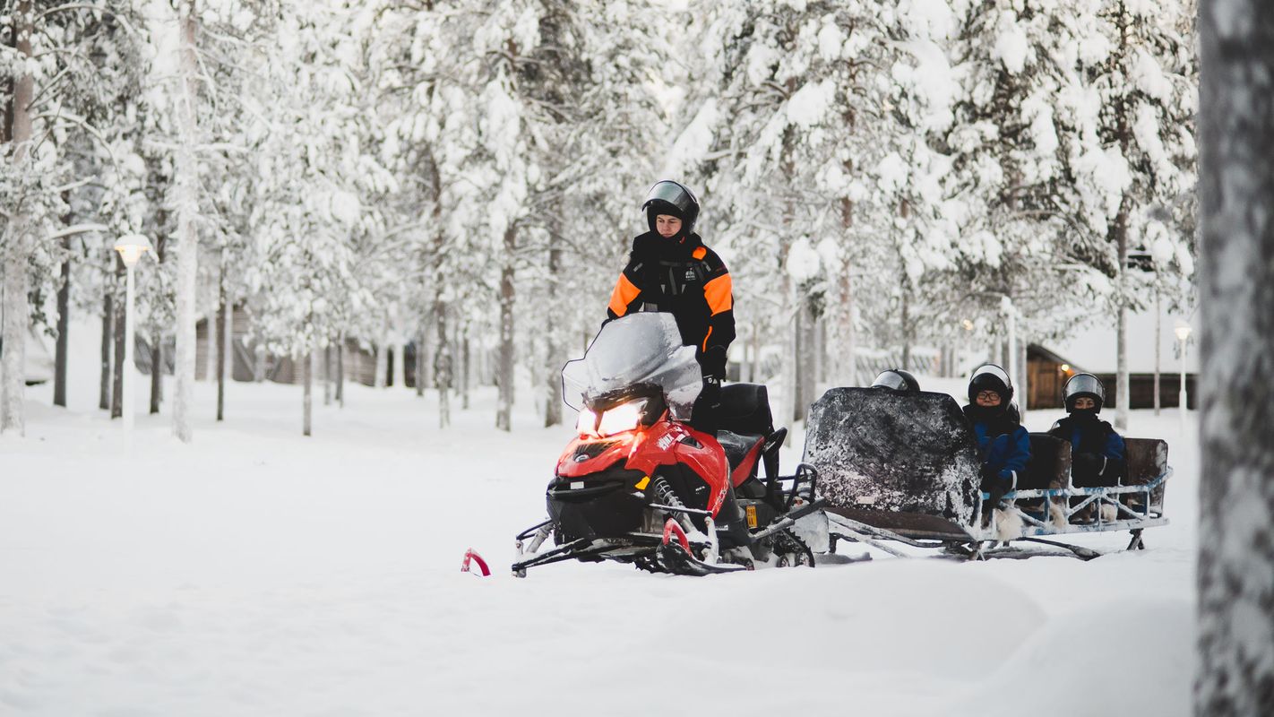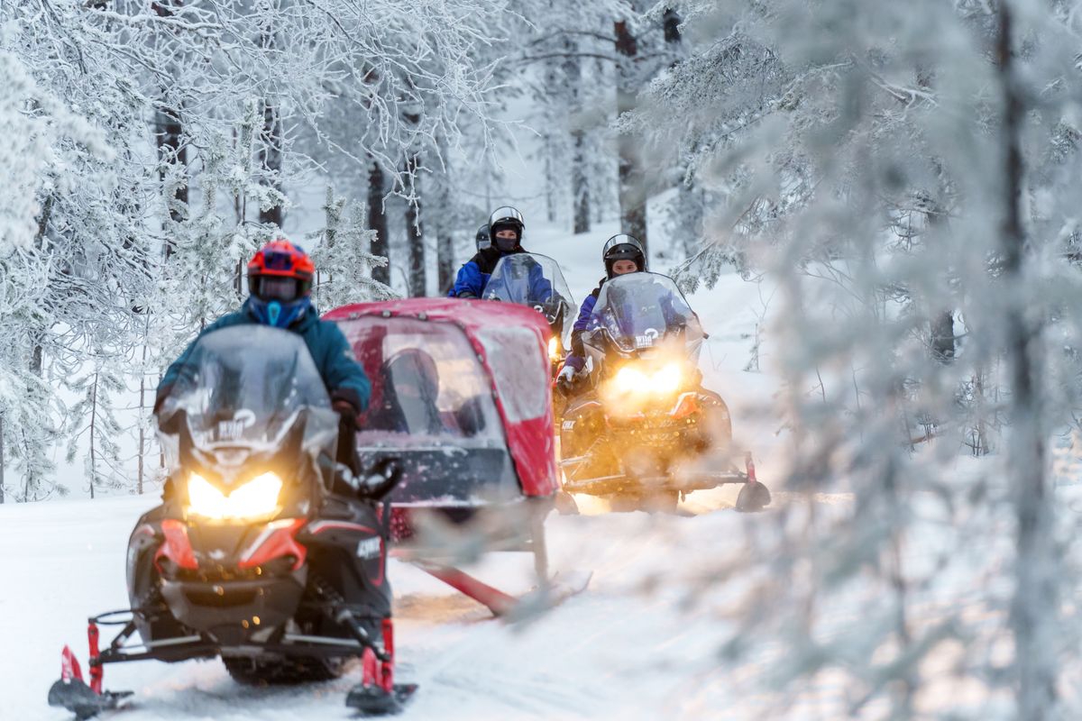The average speed during our short tours is limited due to safety and traffic regulations. Two adults ride on one snowmobile. Children are traveling in the sleigh pulled by the guide’s snowmobile.